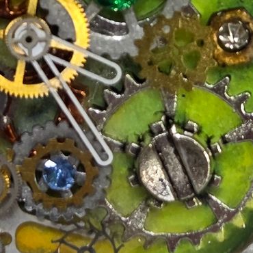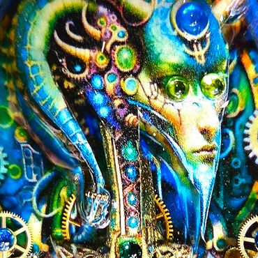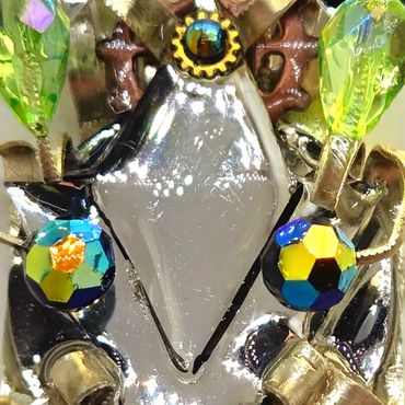 Vibrant, prismatic jewels refract light in dazzling arrays, while intricate brass gears evoke an ethereal charm reminiscent of cyberpunk jewelry. Encased in crystal-clear resin, these elements appear suspended in time, their holographic art accents shimmering with iridescent depth. Each piece is a unique fusion of opulence and industrial grit, creating a timeless, wearable masterpiece that captivates the eye and sparks the imagination.